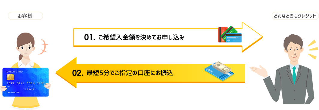 急なお支払いなどで、できるだけ早く現金が必要になっても安心してください。来店&審査不要で即対応致します。振込先はご本人の口座に限ります。